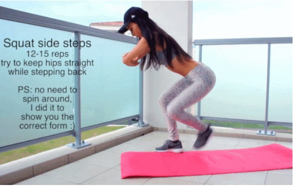 Sentadillas Laterales 3 x 15 Repeticiones. Ten en cuenta que parece sencillo, pero no lo es.