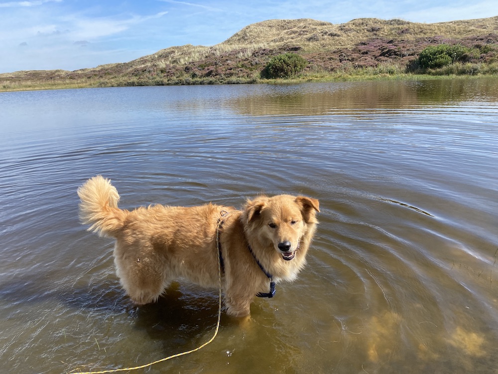 Wir marschierten bei strahlendem Sonnenschein durch eine von blühender Heide durchwachsene Dünenlandschaft mit vielen kleinen Brachgewässern. Schließlich kamen wir am Sandstrand an, den Mäx und ich so geartet nur aus Dänemark kennen. Dort war trotz des super Wetters wenig los - kam ja ohne Fahrrad niemand hin... ;-) Das Beste: Hunde dürfen hier seit 1. September ohne Leine laufen und toben!