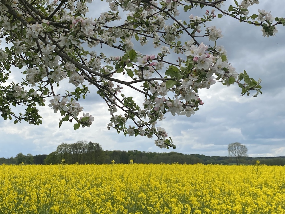 Yes, a field of rape in bloom (good shot with the apple blossom in the lens). Rape is dominating the landscape in northern Germany at the moment - I like the yellow, it puts me in a good mood... ;-)