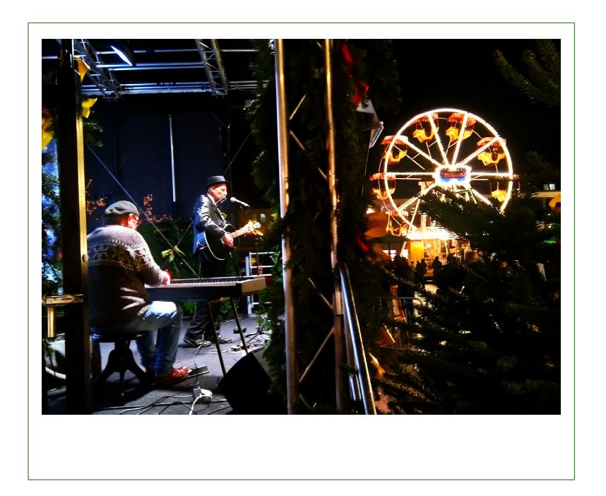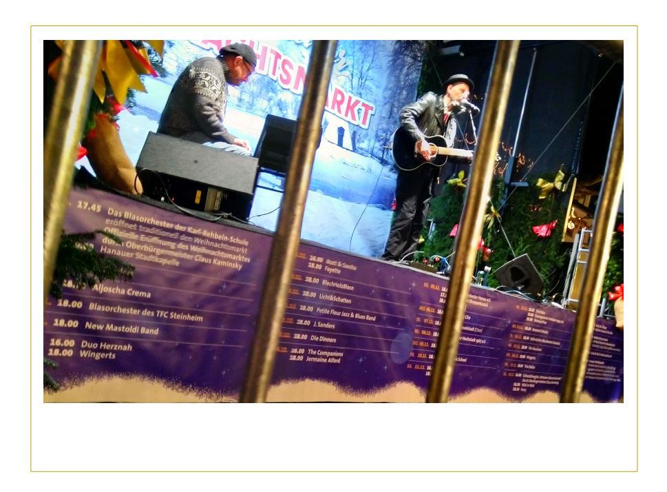Hanau, Weihnachtsmarkt 2021: Die Stimme kenne ich, denke ich, und arbeite mich mit meiner Pommes-Tüte zur Weihnachtsbühne vor. Da steht und spielt in der Tat gerade der Reverend Schulzz.