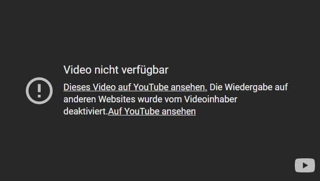 Bei mir erschien dasselbe Bild, das dendrobat gepostet hat. Irgendwas hast du eingestellt, das bewirkt, dass man das Video nirgends anders als direkt auf YouTube anschauen kann.