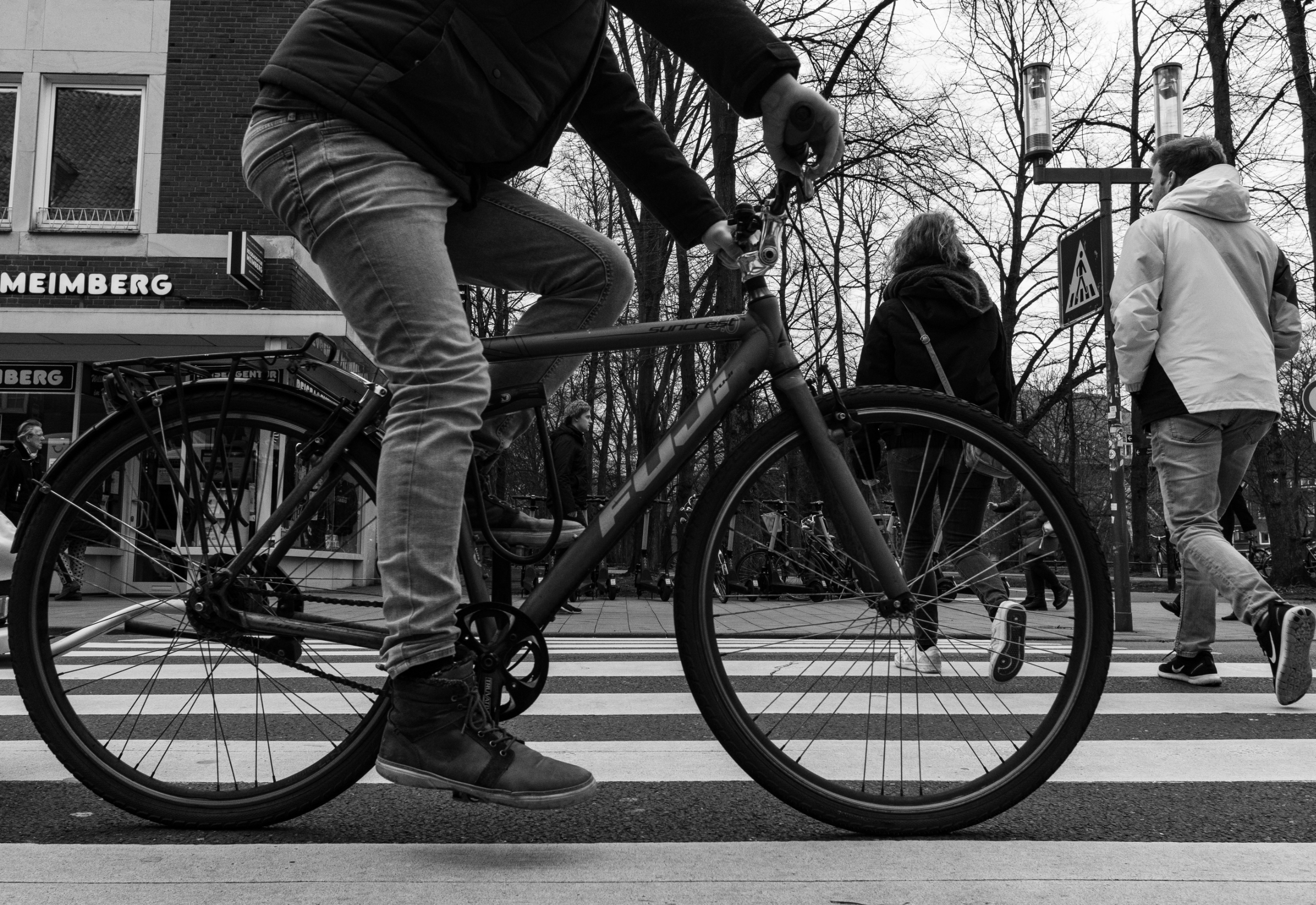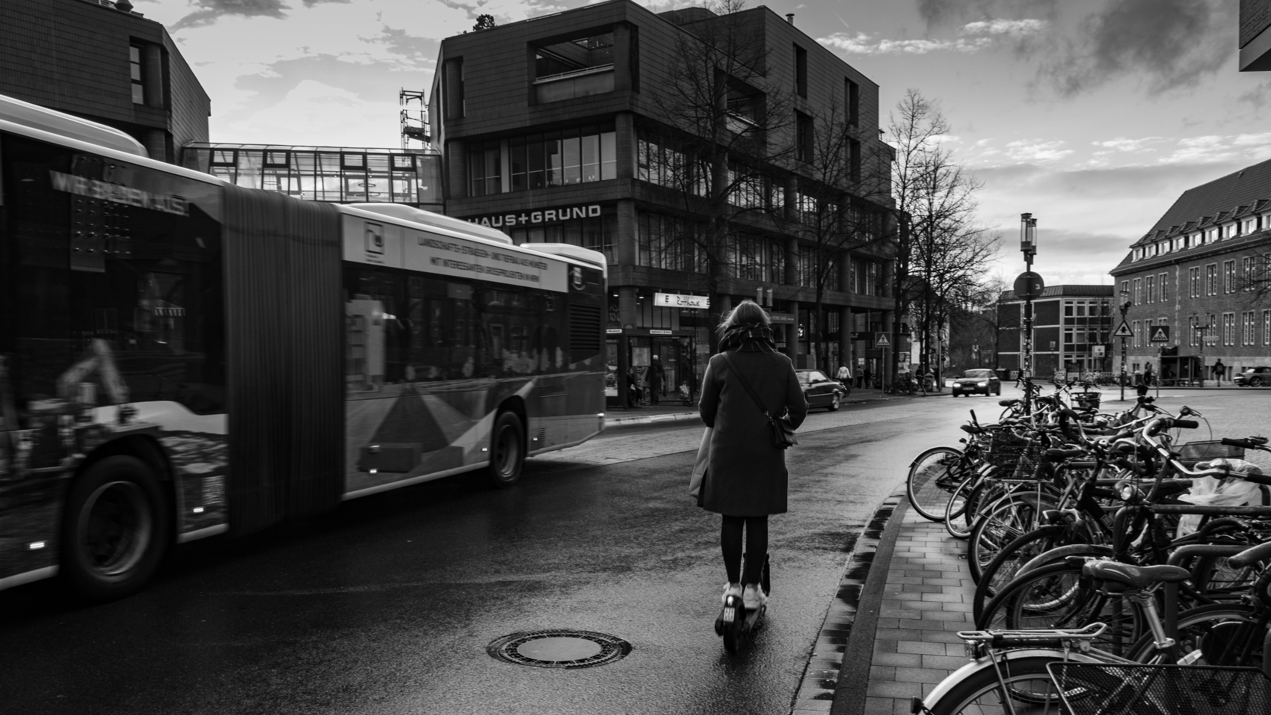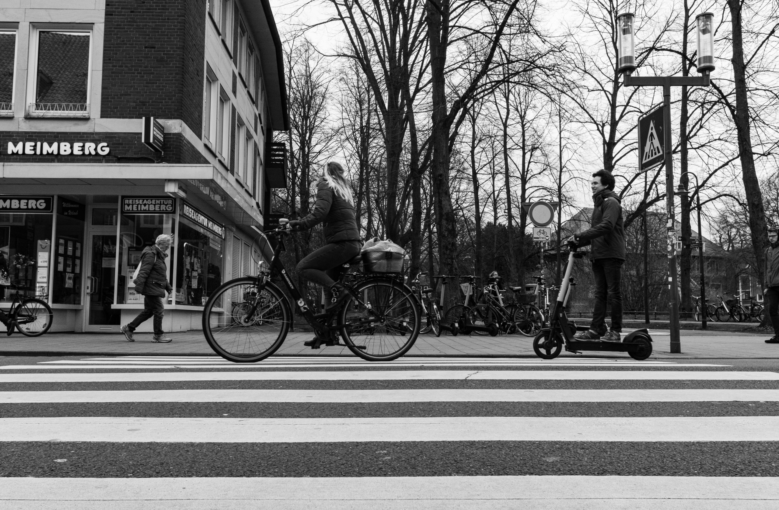 An Menschen sollte es dort schon einmal nicht mangeln - eher zu viele. Aber gut für's experiment. Nach ein paar zaghaften Versuchen, unscharfen Bildern - man muss ganz schön auf Zack sein, wenn Passanten, Fahrräder oder E-Scooter an einem vorbei huschen, wurde ein Zebrastreifen ins Visier genommen. Runter in die Hocke, um eine andere Perspektive zu schaffen, die Kamera in die Serienbildaufnahme versetzt und schießen sobald was interessantes in Sichtweite kommt.