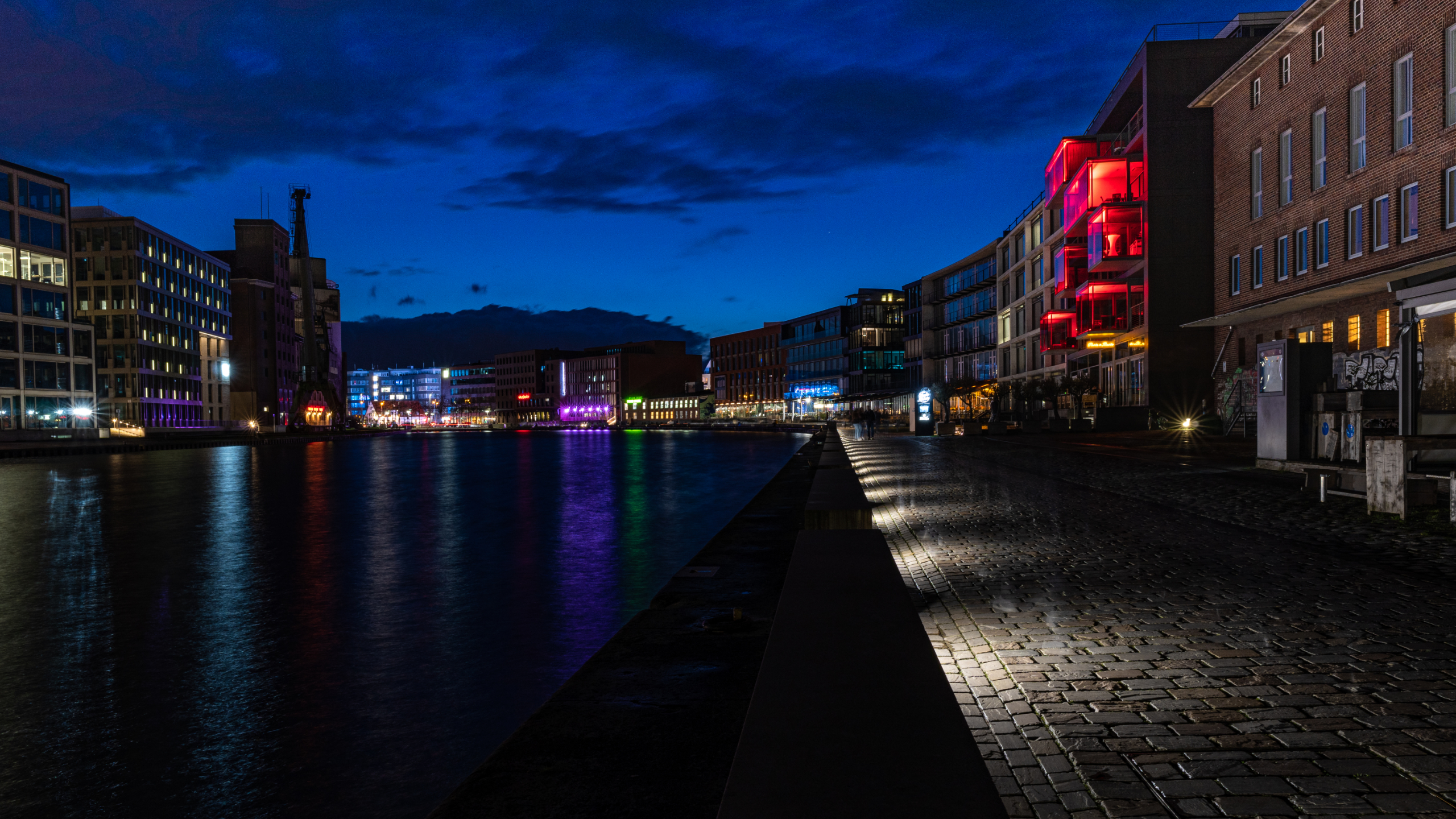 Am Ende ging es dann - zur blauen Stunde - noch zum Hafen Münster. Ich hatte eine Aufnahme im Internet gesichtet, die Reflektionen auf dem Wasser zeigte. Das wollte ich auch fotografieren. Stativ, Mein Sigma 16mm Objektiv hatte ich ja dabei, also fror ich während der langen Belichtung vor mich hin
