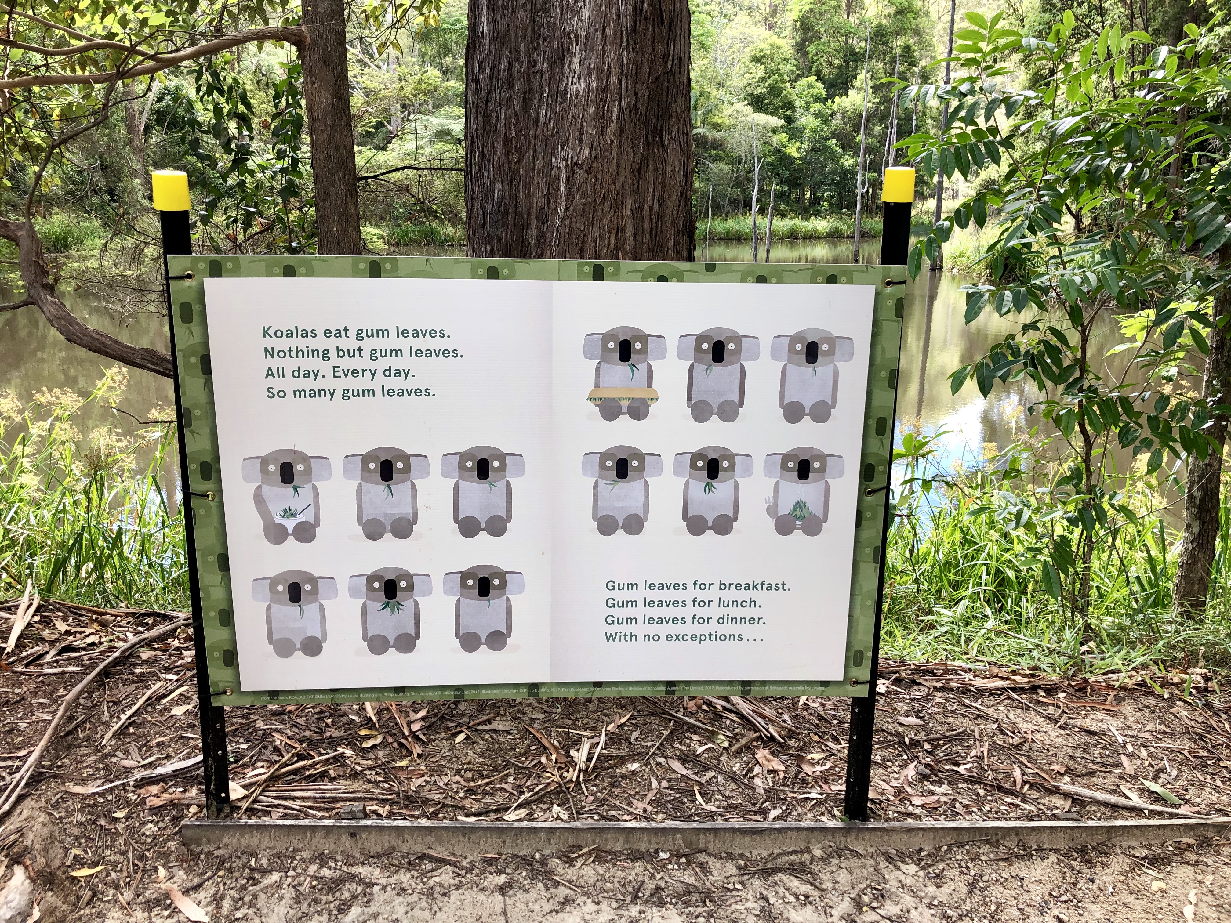 Es gibt riesige Eukalyptusbäume und wenn man Glück hat, kann man Koalas sehen. Wie immer waren wir nicht die Glücklichen. Aber ich sagte meiner Mutter, dass sie nicht nach Hause gehen würde, ohne einen Koala zu sehen, und wir haben immer noch 2 Wochen Zeit, also drücken wir die Daumen.