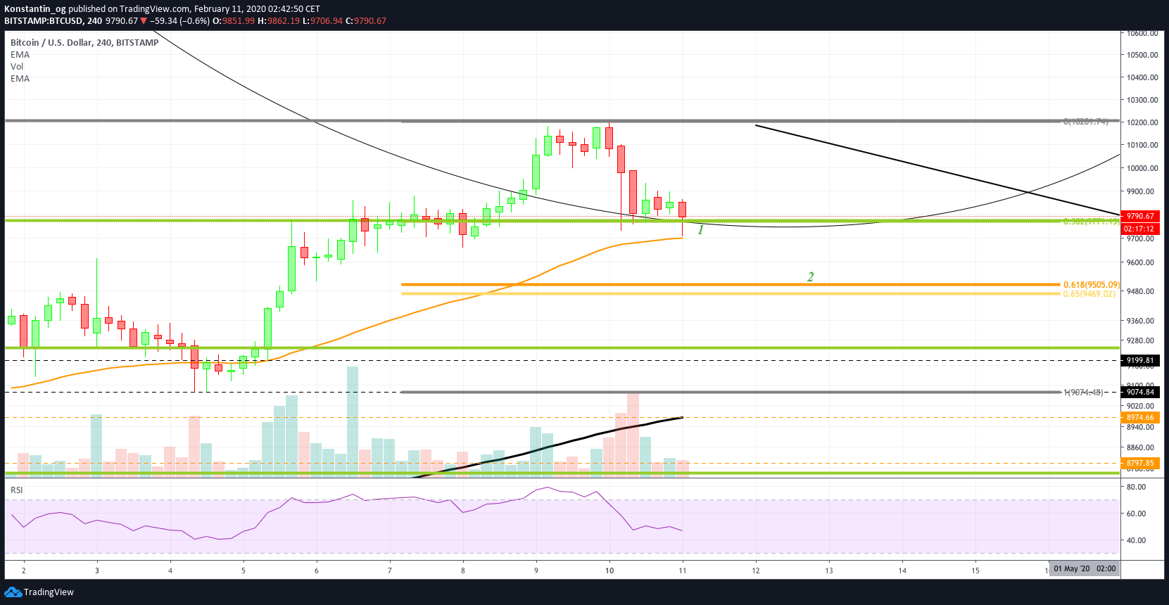 Da aber nicht mal der 4h Kurs eine bärische Divergenz im RSI aufweicht, stehen die Chancen gut, dass die Korrektur sehr mild ausfällt. Daher könnte Bitcoin zwischen dem aktuellen Preis Niveau bei 9.773 $ am 0.382 Fib Niveau, und dem 50-4H-EMA, bei 9.700 $, frühzeitig Unterstützung finden. Ansonsten hätte der Bitcoin Kurs noch die Chance an der Golden Ratio, bei ±9.500 $, abzuprallen. Jedenfalls ist der Bitcoin Kurs mittelfristig äußerst bullisch, daher besteht kein Grund zur Sorge. >>Kaufe Bitcoin zum aktuellen Bitcoin Kurs.<<<