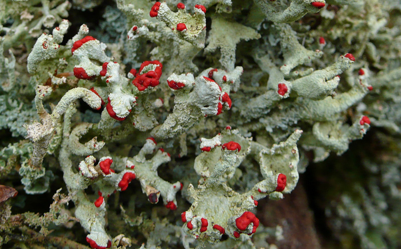 Die Scharlach-Becherflechte (Cladonia coccifera) wächst auf Felsen oder im Heide-Biotop. Da bei den Flechten Pilze involviert sind gibt es auch Fruchtkörper (Apothecien). Mit den roten Fruchtständen gehört die Art zu den schönsten Strauchflechten.