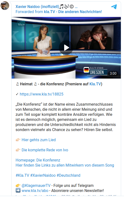 Xavier Naidoo, der vor der Cam "wegen den Kindern" geweint hat, lässt sich jetzt durch "Kla TV" bewerben.