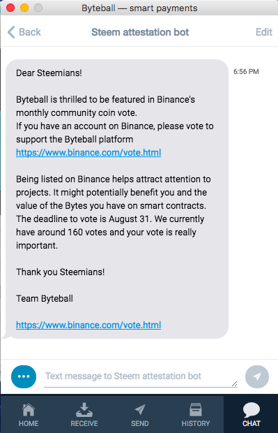 Das Voting hat bestimmt auch einen Einfluss. Möglich kann das dennoch sein. Alle Steemit-User, die das mit dem Byteball-Wallet gemacht haben, haben auch die obige Nachricht bekommen.