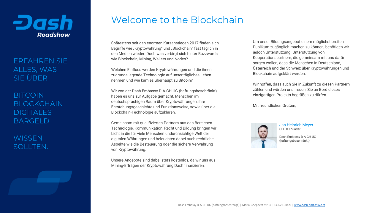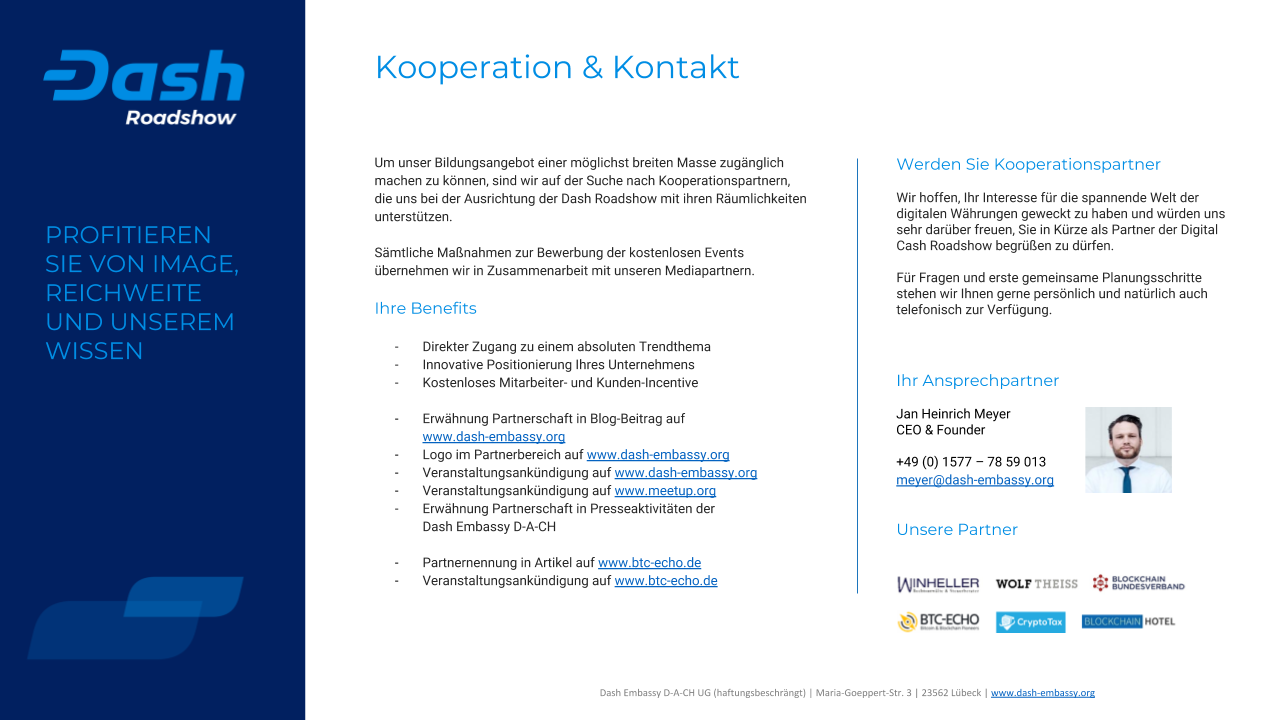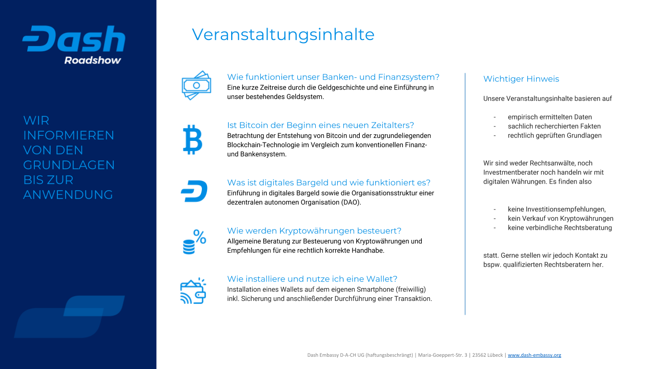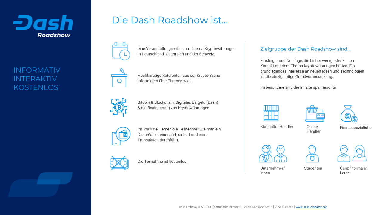 Vorzugsweise suchen wir Coworking-Spaces, Universitäten, Fachhochschulen, IHK, VHS und weitere Hotspots und Bildungsträger, die Lust haben gemeinsam mit uns ein tolles Einführungseventevent in die Welt der Blockchain und der digitalen Währungen auf die Beine zu stellen. Zielgruppe der Dash Roadshow sind Einsteiger und Fortgeschrittene.