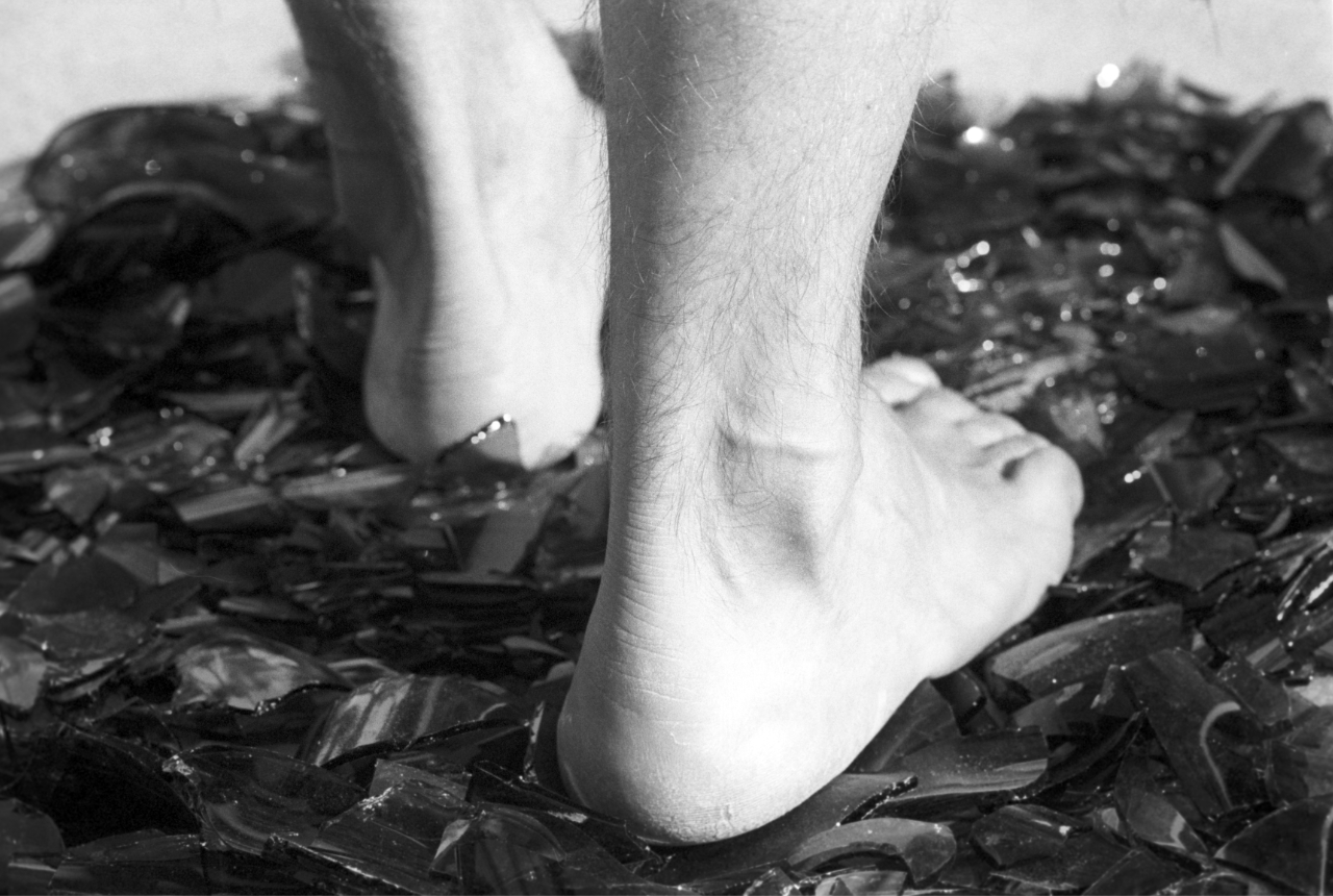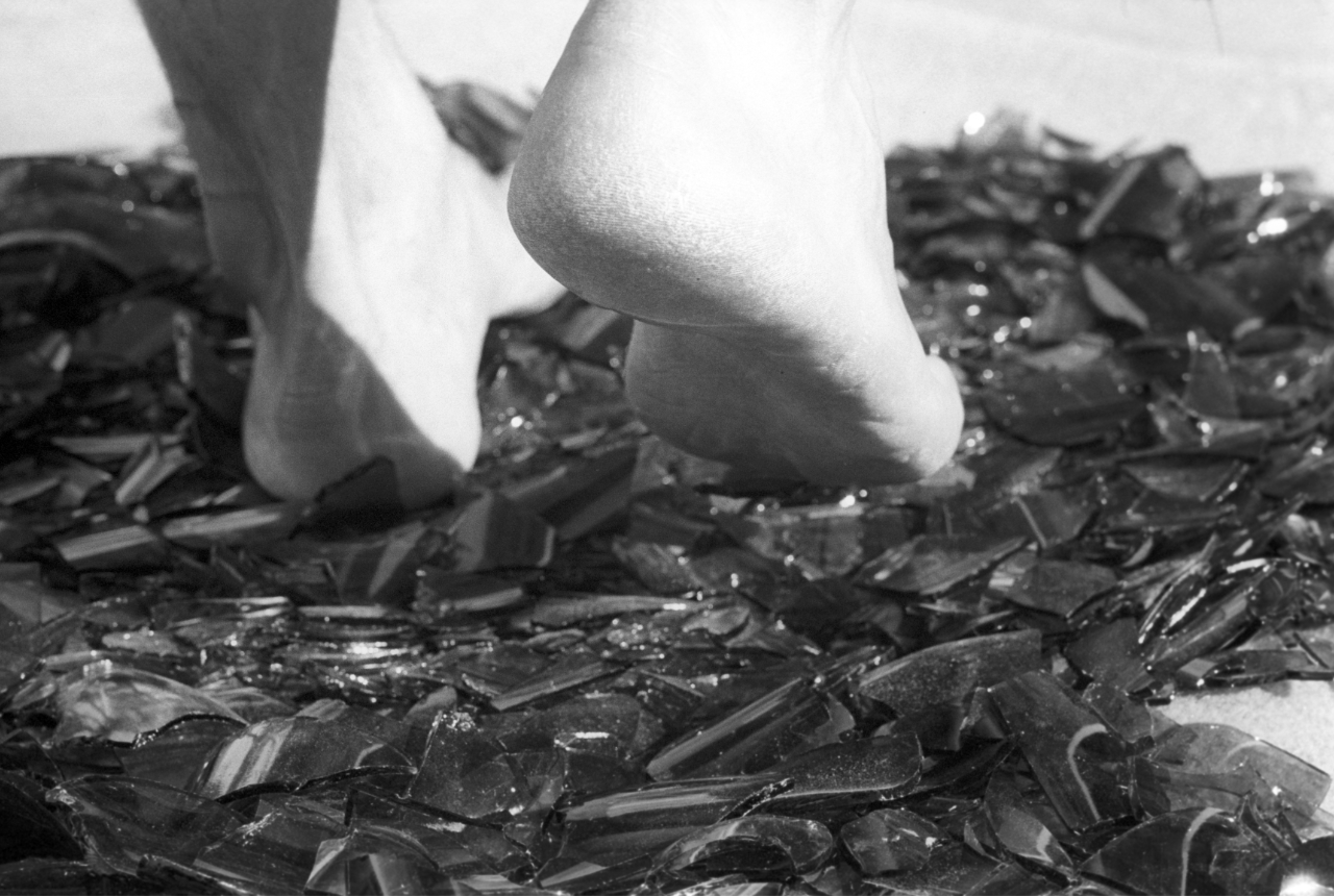 Beim Glaslaufen läuft der Künstler barfuß über Glasscherben.