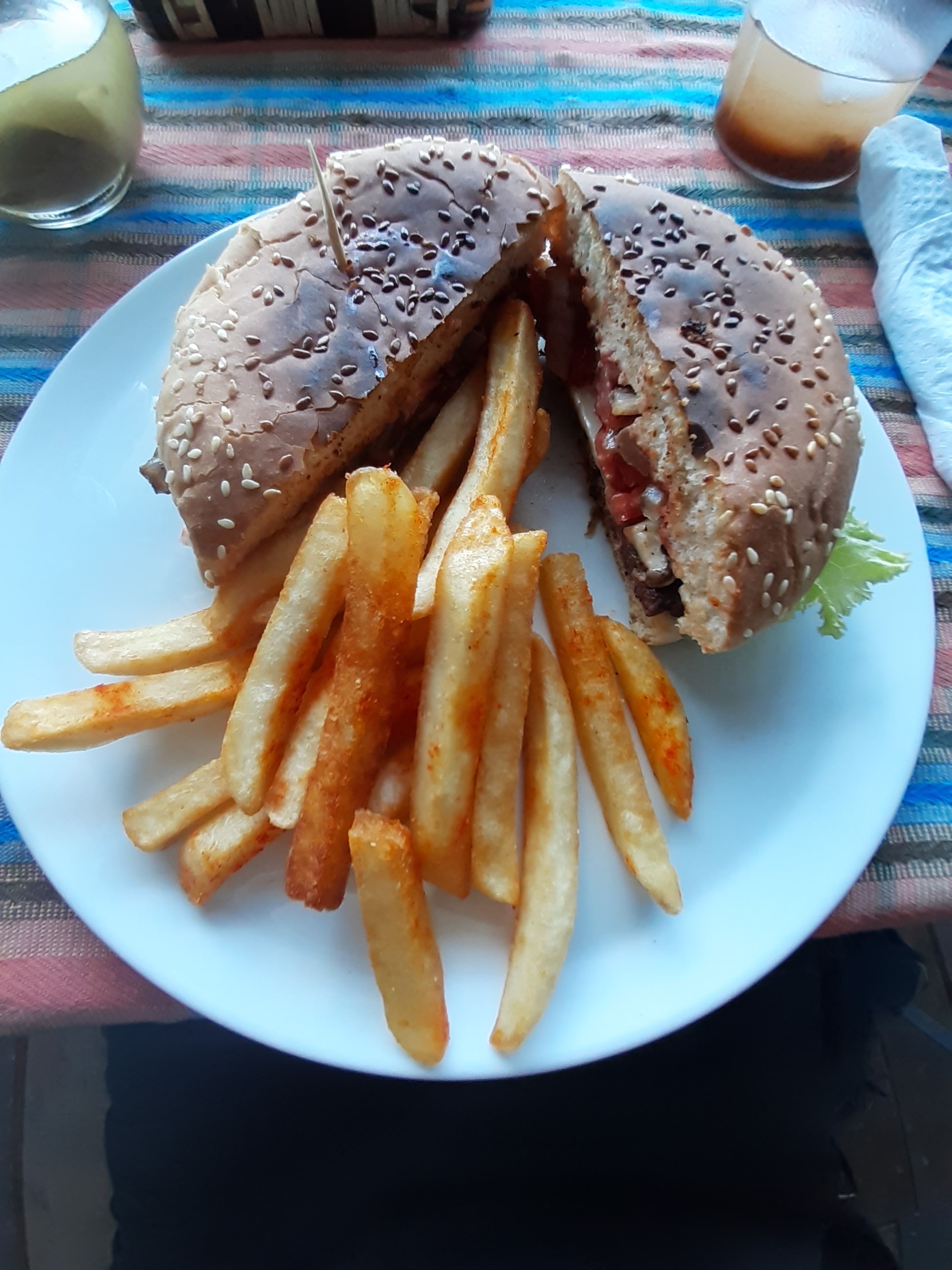 Der TukTukfahrer brachte uns in ein einheimisches, kleines Lokal, wo es anscheinend gutes Essen gab. Einen Hamburger für tolle 15Q und eine Suppe mit Rindsfleisch für angenehme 20Q (ca. 2 Euro).
