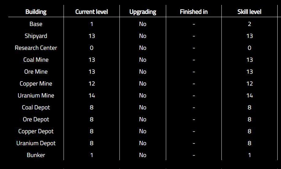 Ich habe natürlich wie jeder als erstes die Rohstoffproduktion ausgebaut und nebenbei die Depots. Bei den Minen habe ich Kohle und Eisen auf Stufe 13 gebaut, Uranium auf Stufe 14 und Kupfer etwas Vernachlässigt auf Stufe 12. Gerade in der Schlussphase beim Explorer auf Level 20, hat sich die eine Stufe beim Uranium schon etwas Bemerkbar gemacht und so konnte man einiges an Zeit einsparen.