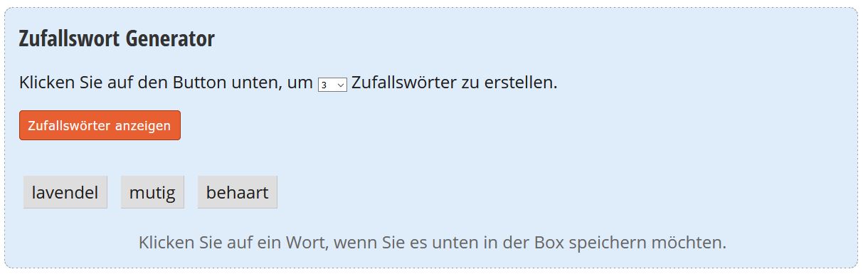 Ich hab mich mal an einer kleinen Geschichte versucht. Drei Wörter wurden vom Zufallswort Generator von Textfixer.de ausgewählt. Diese Wörter müssen in dem Textabschnit mindestens einmal vorkommen.