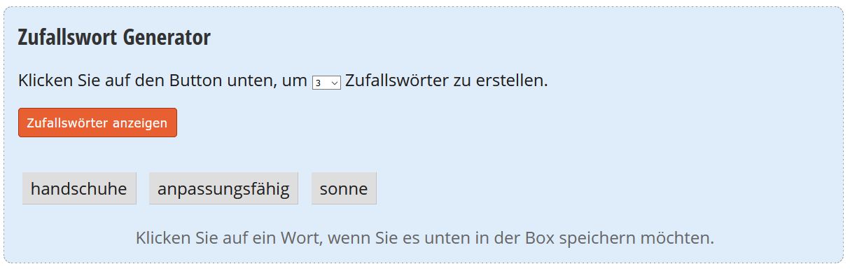 Hier der zweite Teil meines Versuchs. Drei Wörter wurden vom Zufallswort Generator von Textfixer.de ausgewählt. Diese Wörter müssen in dem Textabschnit mindestens einmal vorkommen.
