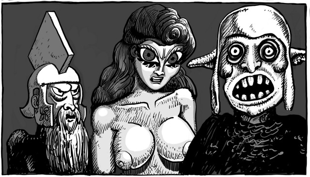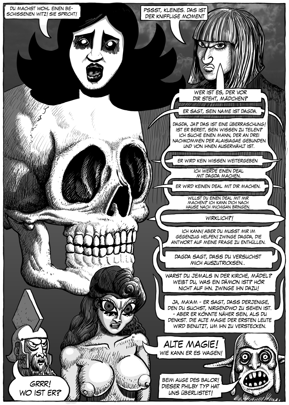 Der Gott Dagda begegnete uns schon einmal auf Seite 49. Ob es sich wirklich um den Gott handelt oder nur um einen Dämon, der sich genauso nennt, vermag ich nicht zu sagen.