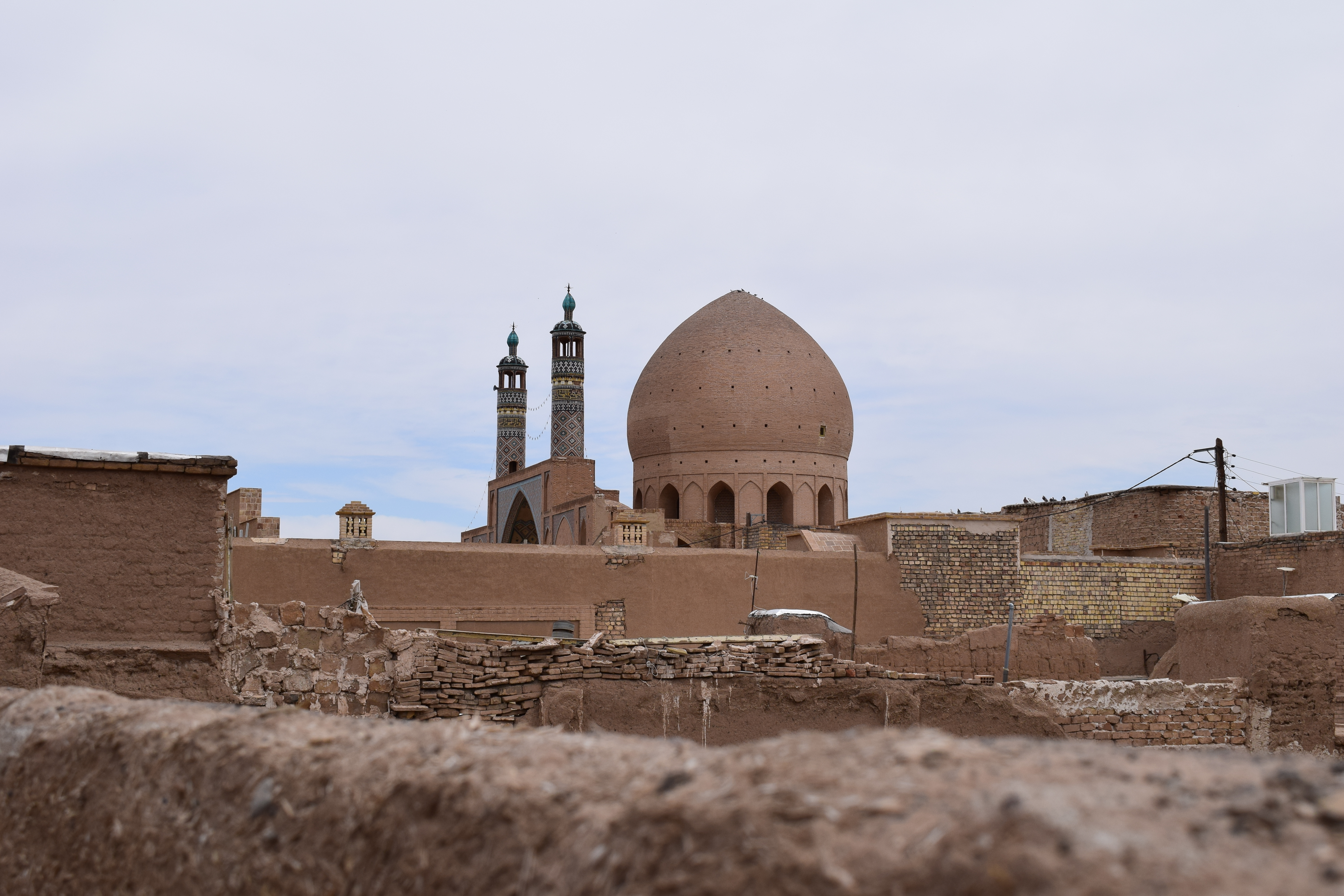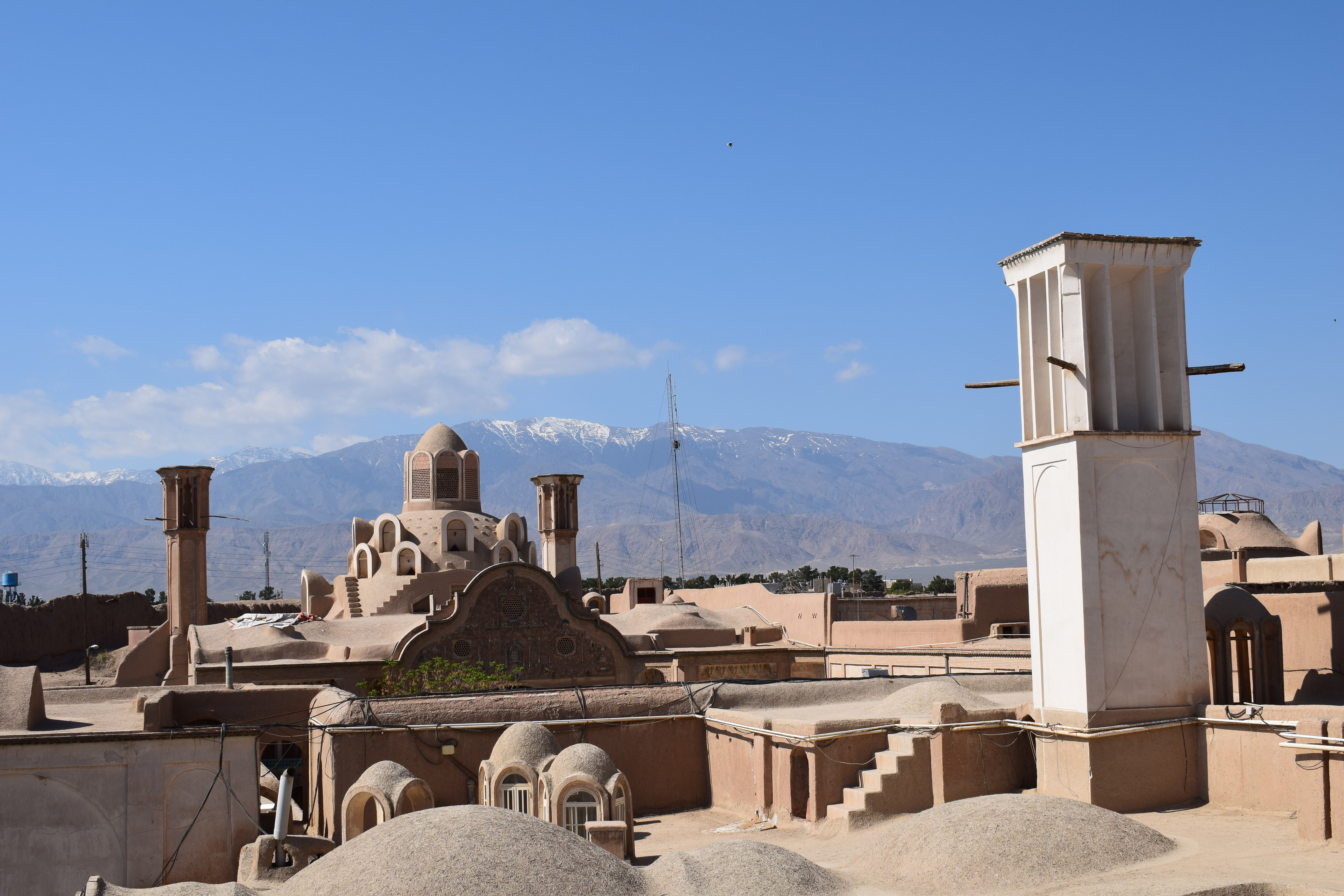 Hier hat man einen schönen Überblick über die Dächer von Kaschan. Diesen Ausblick fanden wir in einem ehemaligen Hamam auf dem Dach. Die drei Türme im Bild die alle gleich ausehen gehören zu den ältesten Klimaanlagen der Welt durch den Wind der durch die Türme gehen wird die Kalte Luft die aus den Bergen kommt in der Wohnung verteilt und man hat auch an heissen Tagen dank dem Wind eine angenehme Temperatur zu Hause.