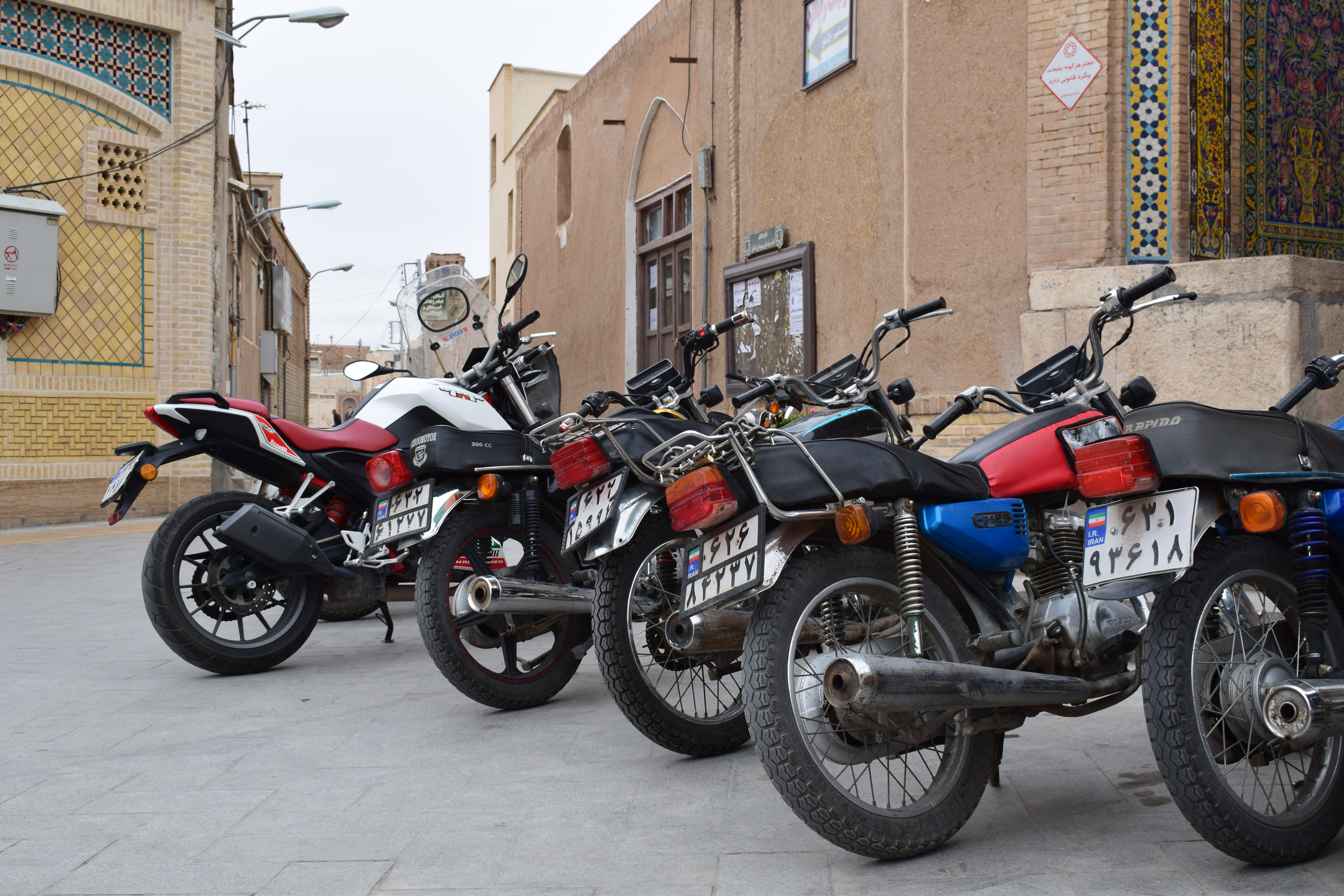 Vor einer Moschee parkierten die Motorradfahrer und was einem schnell auffällt ist, dass im Iran auch die Zahlen ganz anders sind wie bei uns und deshalb wäre es ratsam sie schon im vornherein auswendig zu lernen, weil viele Restaurant in denen ich war nur die Persische Zahlen im Preis drinnen hatten.