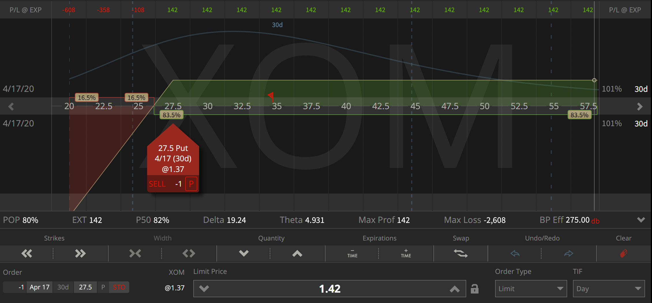 Wenn wir eine Put Option mit Ausübungspreis $27.5 zum Preis von 1.34 (=$134) verkaufen, dann gehen wir die Verpflichtung ein, dass uns der Käufer der Option innerhalb der nächsten 30 Tage hundert Stück Exxon Mobile zum Preis von $27.5 verkaufen darf und wir die Aktien übernehmen müssen.
