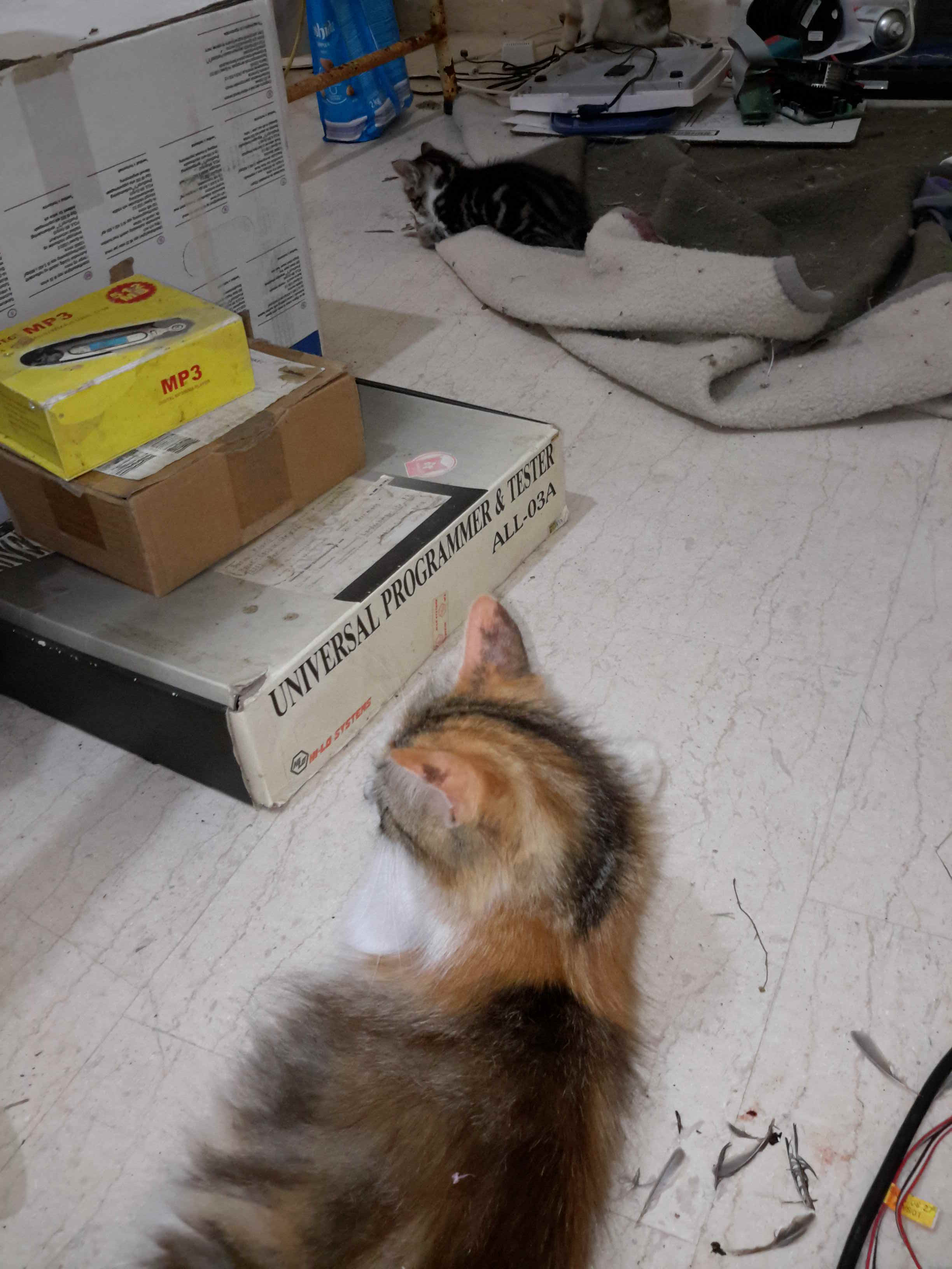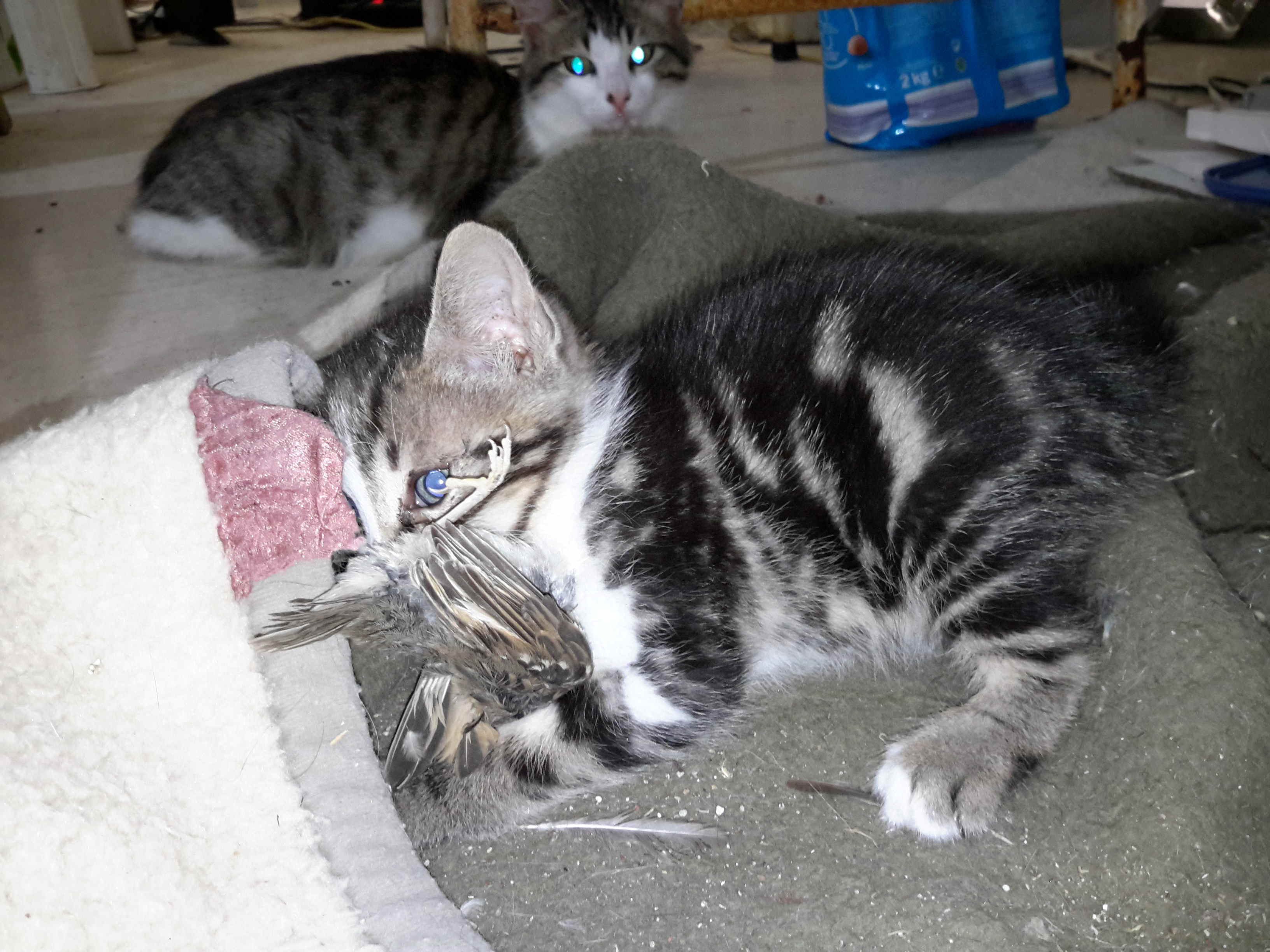 Die Mutter schläft am Ende zufrieden ein, als die Kleine sich zunehmend in ihre Bestimmung hinein steigert, ihre Beute erst noch 30 Minuten durch mein Arbeitszimmer schleppt, dabei Geräusche von sich gibt wie man sie von einem knapp 2 Monate alten Katzenkind nicht wirklich erwartet, und sie dann nach allen Regeln der Kunst fachgerecht zerlegt.