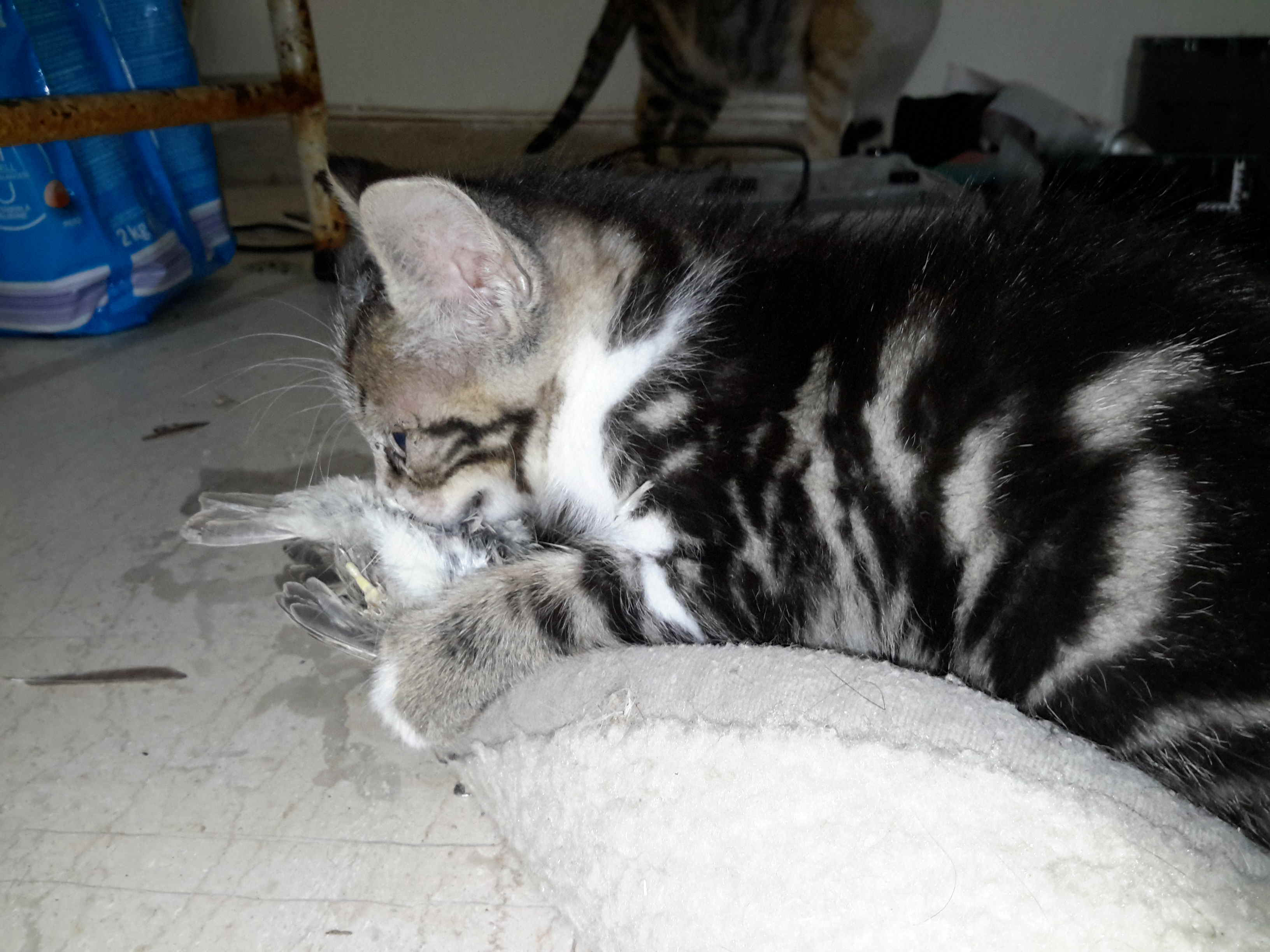 When the kitten recognized how a bird is good for it started to make strange noises ran through the room with the bird in its mouth. Mom did here job and gone to relax and watch here baby slaughter the bird...