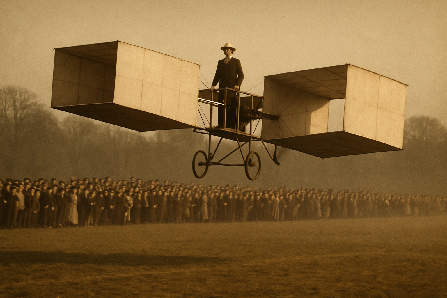 Moment mal - hatten nicht die Brüder Wright schon 1903 den Erstflug geschafft? Hier wird's interessant: Die Wrights starteten damals mit einem 𝓒𝓪𝓽𝓪𝓹𝓾𝓵𝓽 und Gegenwind. Santos-Dumont war der erste Mensch, der aus eigener Kraft startete, vor Publikum flog und sicher landete! 🎯
