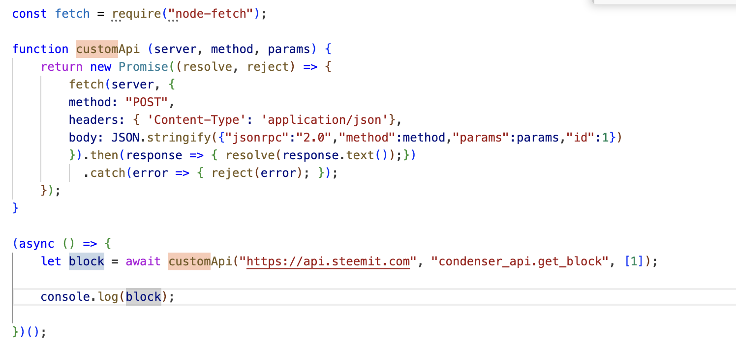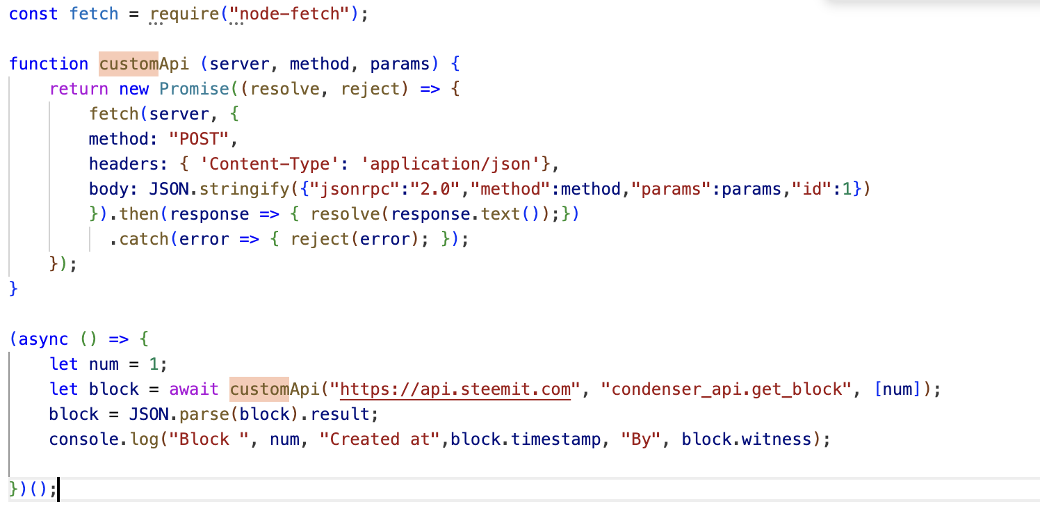 Now let's move this to JavaScript, I will create a file called connecting.js and in it I will create a function that allows me to call any plugin and method of the Steem API using fetch which makes an HTTP Post call, this is very practical because with a method like this you can read almost any information of the blockchain without external libraries.