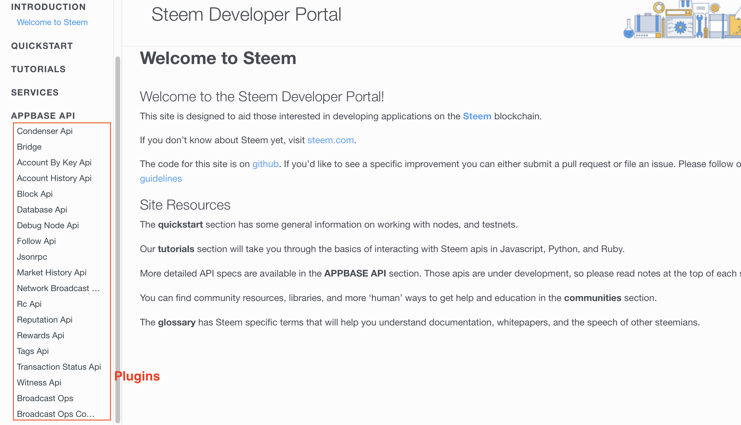 On this site you will find tutorials in different languages, Glossary of terms, and many useful resources when developing in Steem, but the most important part is the one that says APPBASE API, there you will see the list of Plugins available in the Steem API.