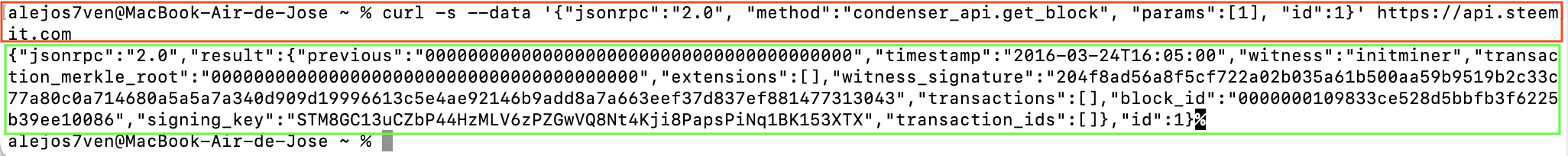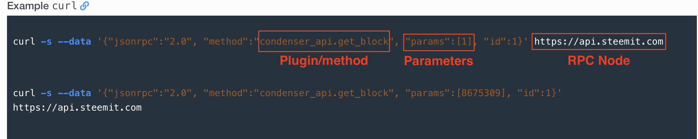 For example, in the examples we see how they use the Steemit RPC, they connect to the condenser_api plugin, and call the get_block method to obtain information from the specific block. In this case we will see the information from block number 1.