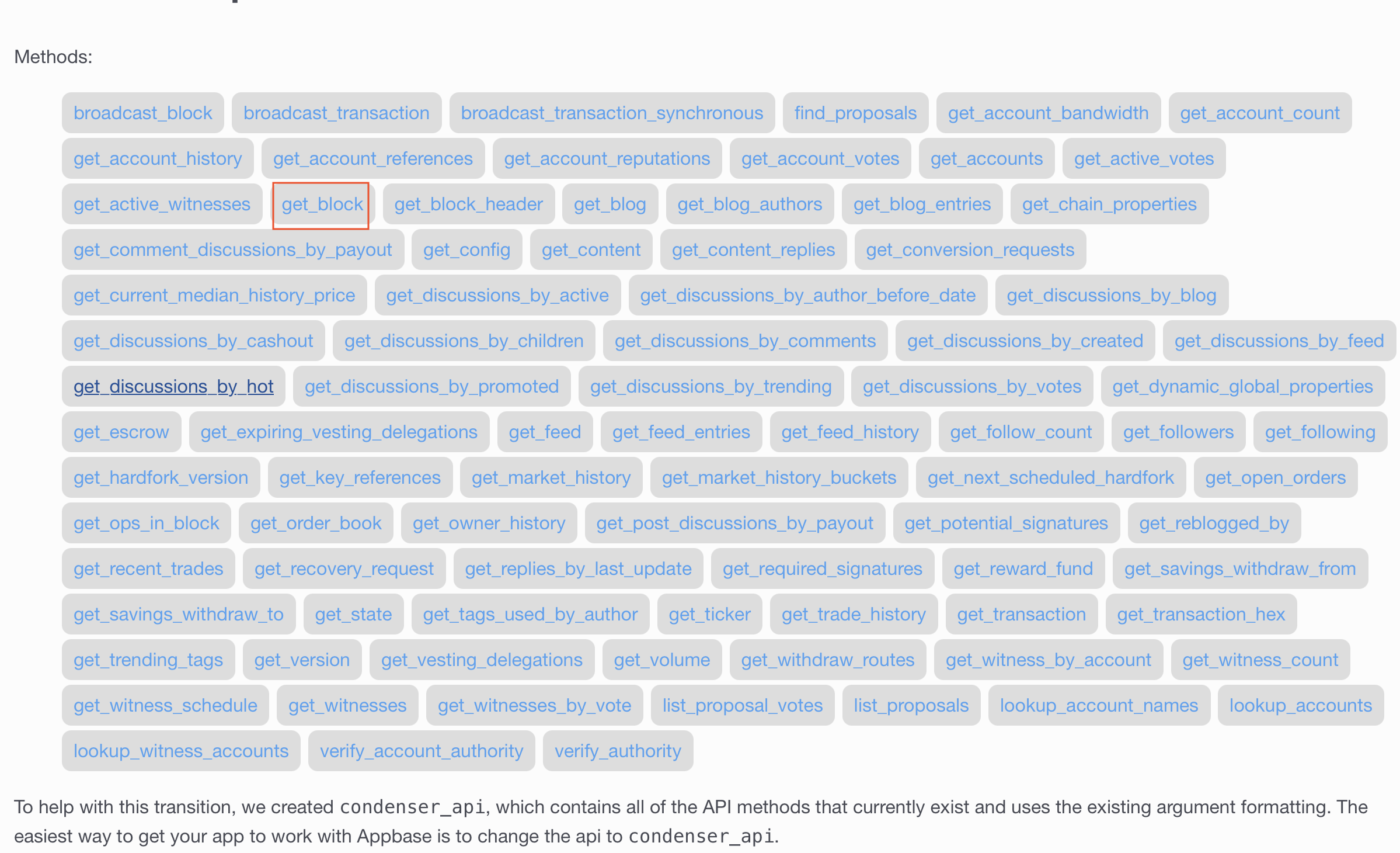 Each plugin allows you to obtain specific information from some section and each RPC node can have more or less plugins enabled. For example, if we enter the Condenser Api plugin which is the largest and most complete, we will see the list of methods that that plugin allows us to use. For example, we are going to review the method get_block, which as its name suggests will allow us to obtain the information of a specific block.