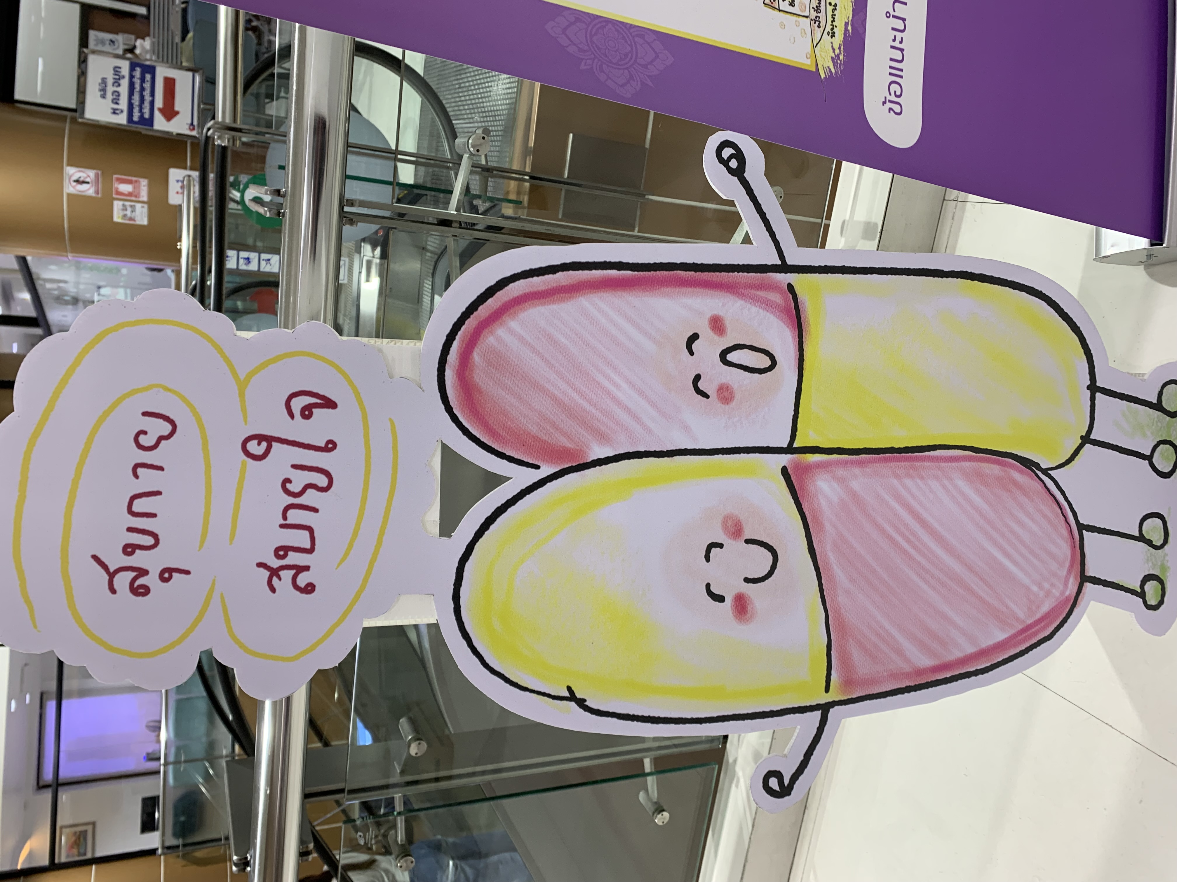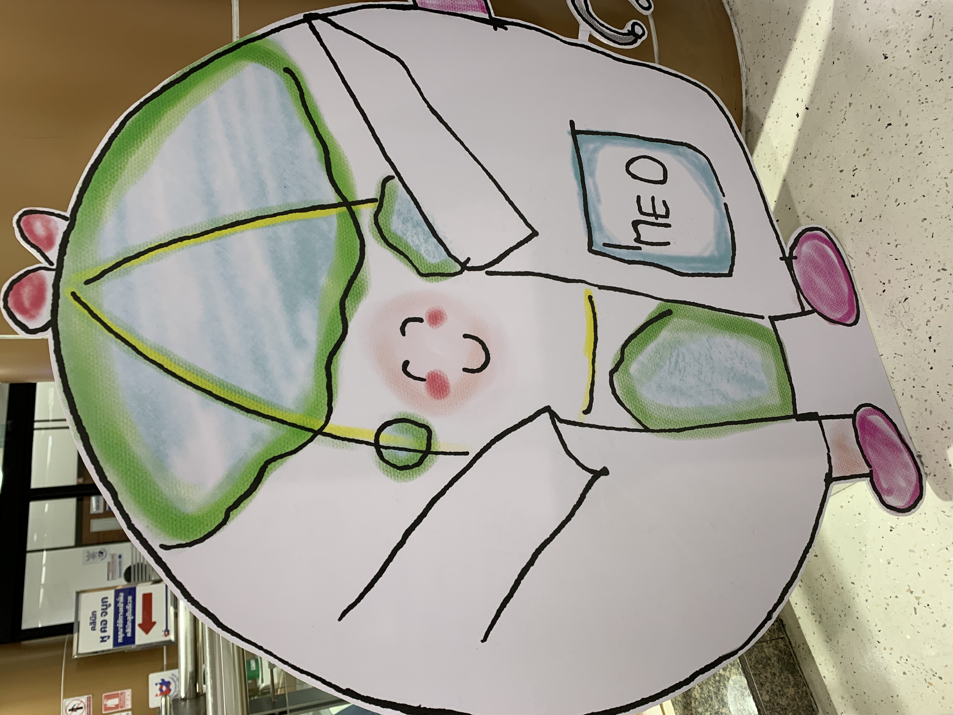 The first things that attracted my eyes are the cartoons of doctor, nurse, tablets, kids, and monk, which made me feel peaceful.