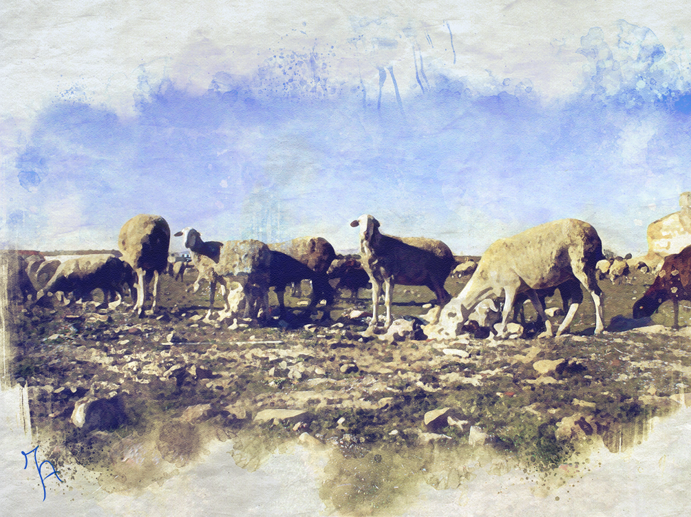 Obra digital elaborada a partir de una fotografía propia tomada a un rebaño que pastaba en un erial, junto a unas ruinas, en el antiguo camino de Manzanares.