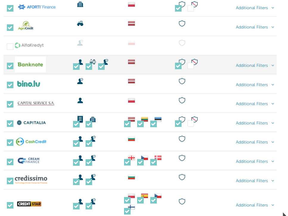 Die Kredite selbst habe ich grundsätzlich einfach alles drin, was einen Rückkauf drin hat. Das sind die simple mit einem Schild. Bei einigen Anbietern gibt es beides und Du siehst auch, dass ich durchaus einige neue noch gar nicht eingepflegt habe. Eine Diskreminierung nach Land oder Lohn führe ich momentan nicht durch. Der Rückkauf ist mein einziges Kriterium:
