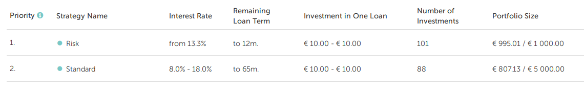 Das Autoinvest richtet sich ein wenig danach, was Du bereit bist für ein Risiko zu übernehmen. Ich selbst habe das Portfolio in zwei unterschiedliche Risikogruppen unterteilt. Einige mit recht hohen Risiko und höheren Zinsen, aber gleichzeitiger kurzer Laufzeit ... und langläufern mit etwas weniger.