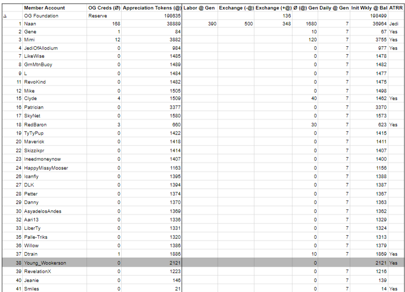 In Block #208, ending 10/4/2021, a total of 2651@ (Appreciation Tokens) were generated; 371@ were generated by the daily appreciation of 53 members, 390@ were generated by 39 hours of labor exhausted for the Cooperative, and 1890@ were generated by 189 OG Creds (Ø); bringing the total to 334,314@.