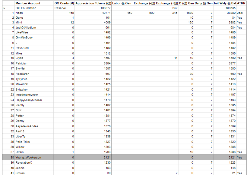 In Block #209, ending 10/11/2021, a total of 2711@ (Appreciation Tokens) were generated; 371@ were generated by the daily appreciation of 53 members, 450@ were generated by 45 hours of labor exhausted for the Cooperative, and 1890@ were generated by 189 OG Creds (Ø); bringing the total to 337,025@.