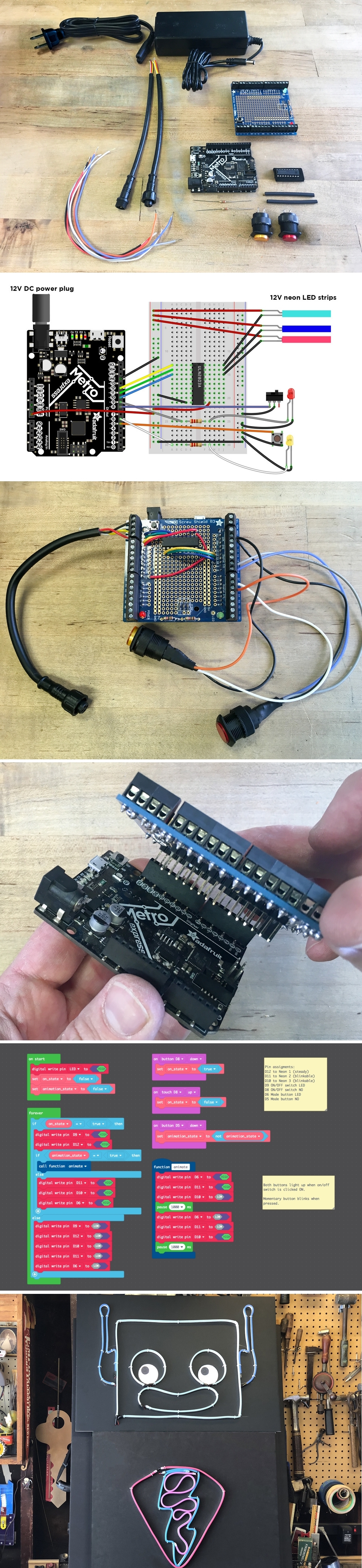 This is a great adafruit project for lovers of neon lights, because with this guide you can build any shape you want, with flashing animation from neon-like LED strips. You don't need high voltage, the LED strips only need 9V to 12V. You will also learn how to best control the flashing animation using a microcontroller and a Darlington transistor driver.