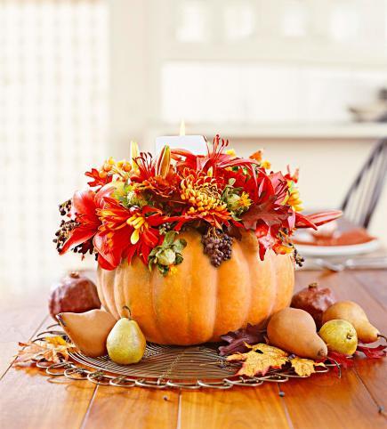 A pumpkin "basket" makes an imaginative centerpiece for a fall table.
