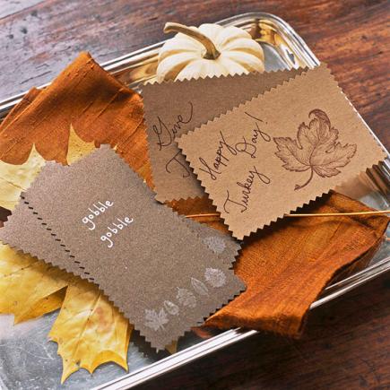 These simple cards send seasonal messages or identify where guests sit. Cut cardstock with pinking shears and decorate with rubber-stamp designs and handwritten messages. Choose tone-on-tone or metallic ink for a sophisticated look.
