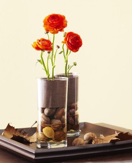 Add Thanksgiving flavor to a tabletop or mantel with cylinder vases filled with nuts and flowers. Roll coordinating scrapbook paper into decorative cuffs that slip inside the vase. Vary the look by substituting wheat, branches or snips of any pretty leafy plant for the flowers.