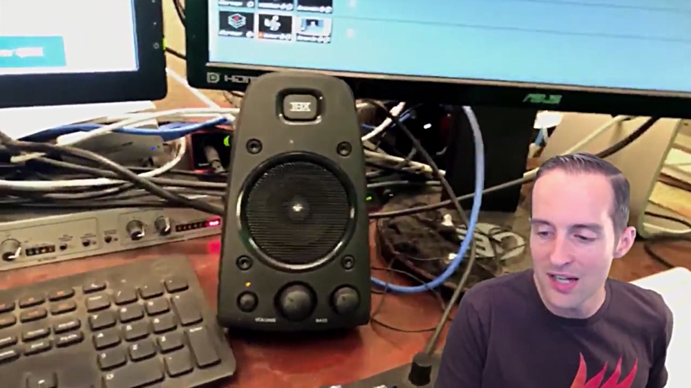 So, I've got these Logitech speakers for about a hundred dollars. Then, I've got a subwoofer under my desk that hits me in a nice pace.