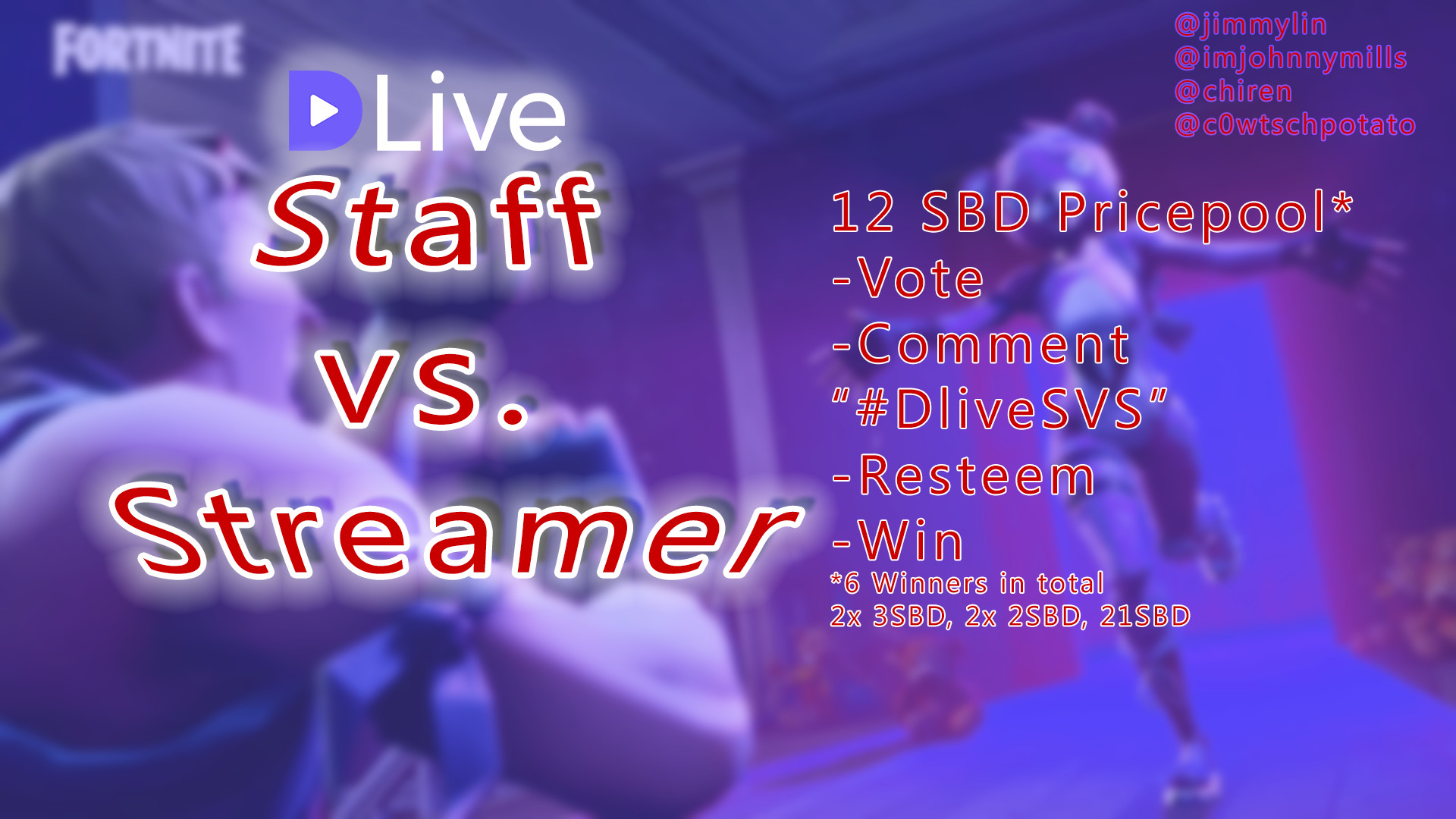 Im trying to get a partner for this, someone who also streams. My general idea is: 2 Teams of 2, we play 10 games and the team with most kills after that pays 6 sbd each (3 winners for each streamer, 3SBD, 2SBD and 1 SBD) to viewers. to be able to win, the viewers will have to upvote resteem and comment with #StaffvsStreamer. Best date for me would be next week, maybe Monday or Tuesday since im gonna be in france at the end of next week. Im currently trying to photoshop an image to sum that up and promote the wager before it starts.
