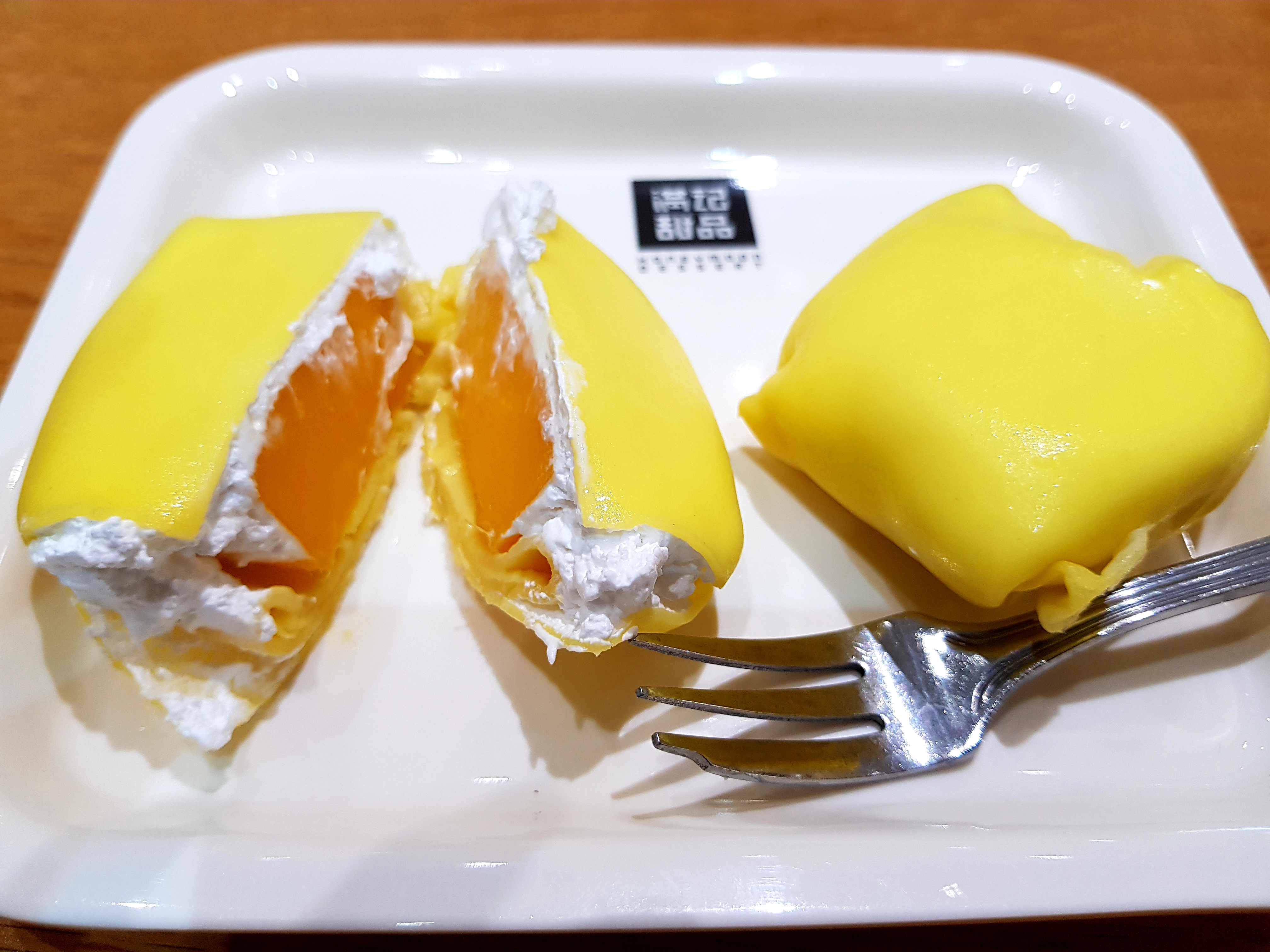 芒果班戟外型四四方方,切开柔软的班戟皮,便可以看到里面大块的芒果果肉和新鲜忌廉。咬上一口,整个口感非常丰富,十分享受!