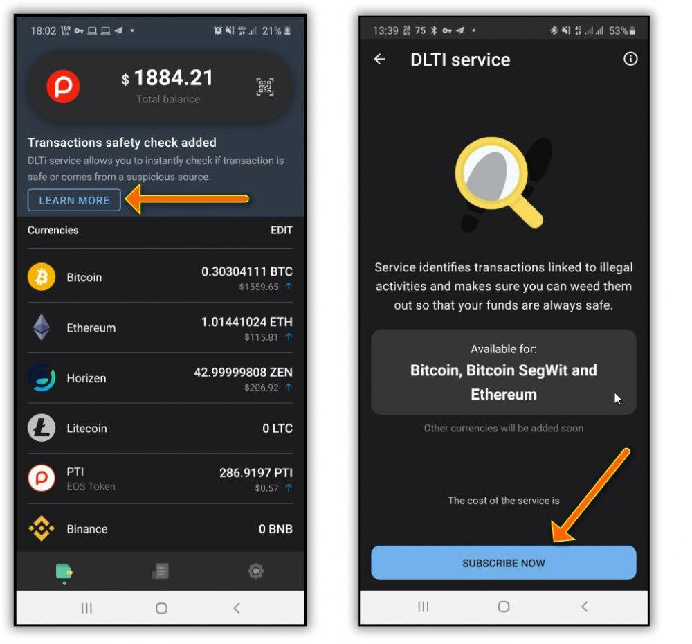 - Connect DLTI service, which identifies potentially dangerous transactions and suspicious blockchain addresses.