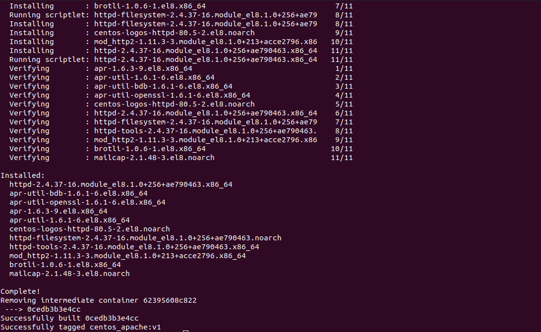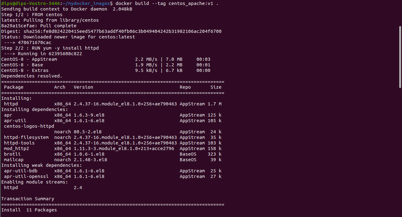 So this above command will build a custom docker image which I have named as centos_apache and the version is v1.