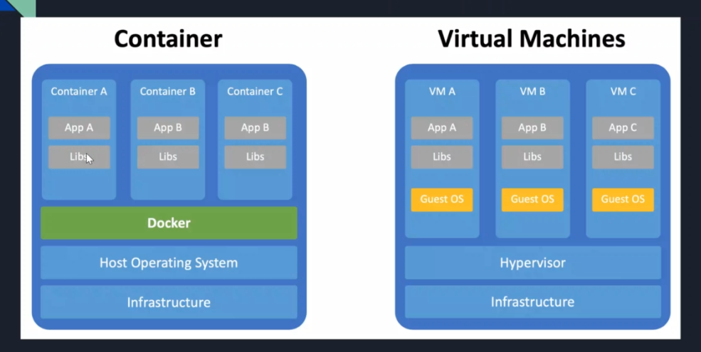 Virtual Machine has layers of infrastructure,Hypervisor that manages the VMs. Each one of the VMs need to have individual OS.