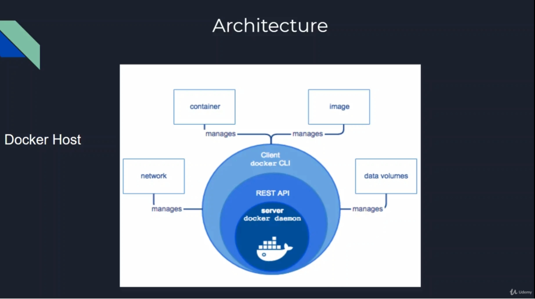 We need to know about Docker host. Once we install docker in a machine it becomes docker host.Docker host is the house of all the containers. So a Docker host is capable to run containers and build images in it. Docker daemon is a server and that is the process that started once docker is installed. Then docker ecosystem has a client. Client talk to the server through an API. And the docker daemon gives an answer back through the same API to the client. So when we write commands in docker we are actually writing REST API calls to the server and the server is giving back its response. And the docker client manages the network, container, image, data volumes.