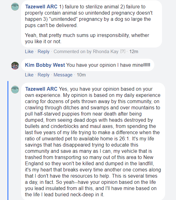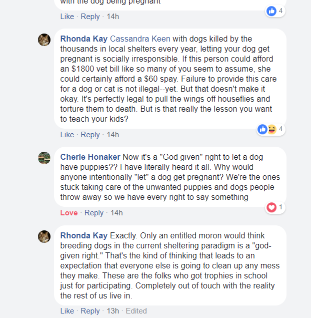 Sadly, many people believe allowing a dog or cat to reproduce is their "god-given right." This comment made by me through the rescue account sums up my feelings on that lunacy.