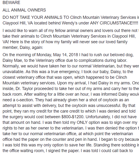 Yesterday, someone launched a smear campaign against Dr. Taylor and her practice. I'm all about leveraging social media to make a point. However, when you go off half-cocked and don't even understand the law regarding such things as veterinary liens, you not only cause a lot of harm to a lot of people, but you make yourself and your community look like blithering idiots.