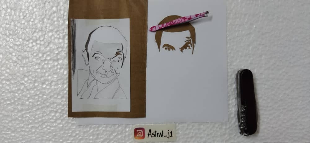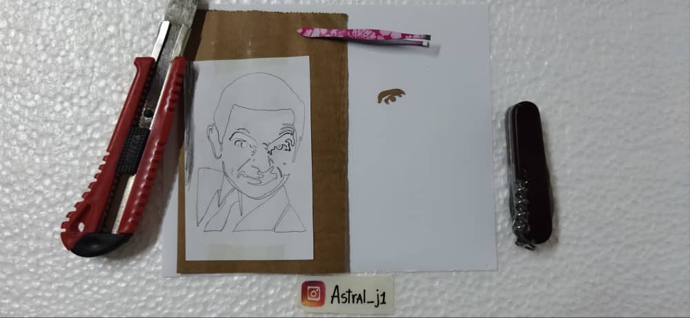 Continuo recortando la silueta poco a poco, comienzo por sectores complicados y pequeños como lo son arrugas, expresiones faciales, ojos, nariz, boca, y luego voy con cosas más fáciles con trazos largos como la ropa, cabeza, cabello, quijada..