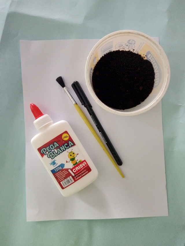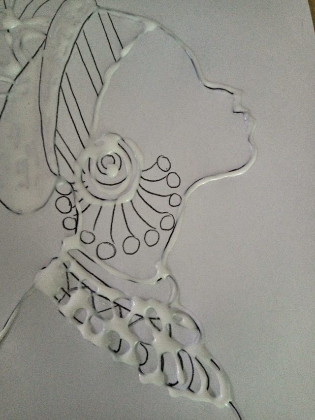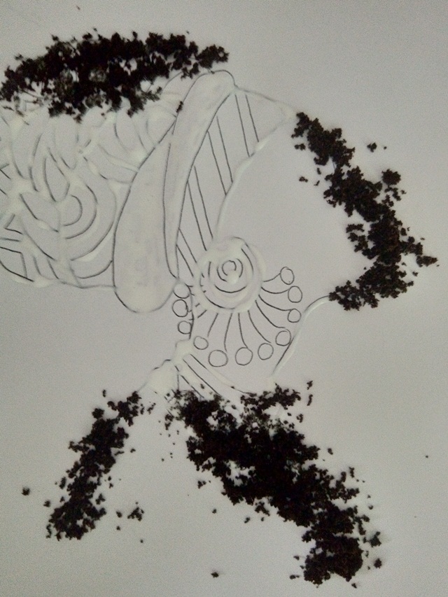 Paso 2. Una vez realizado el dibujo, le añadí pega blanca por toda el área que quería realzar con el café. Me asegure de que las áreas quedaran bien impregnadas de pega para que luego se pudiera adherir bien el café.